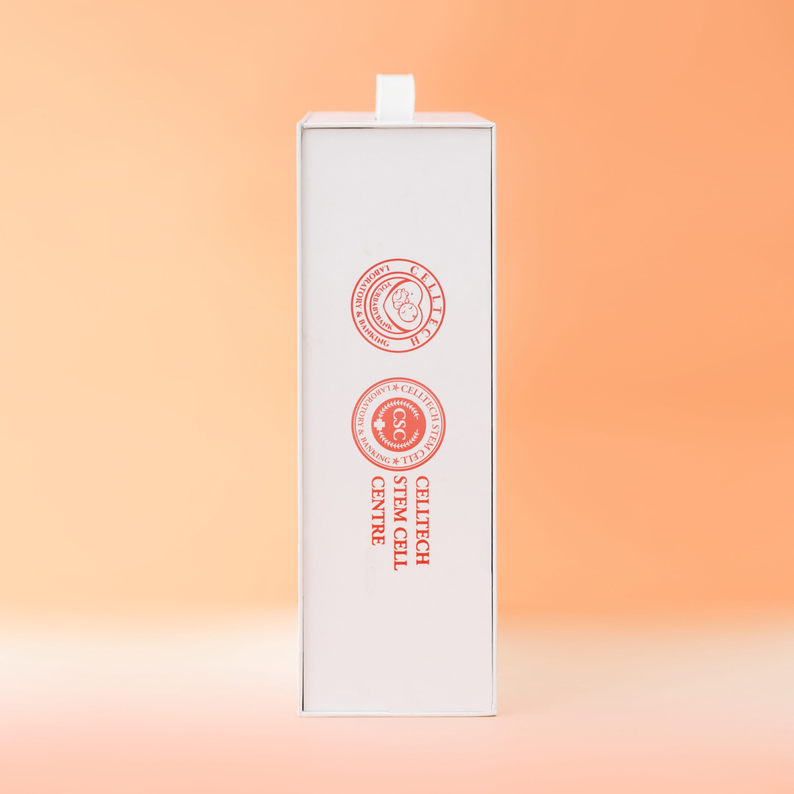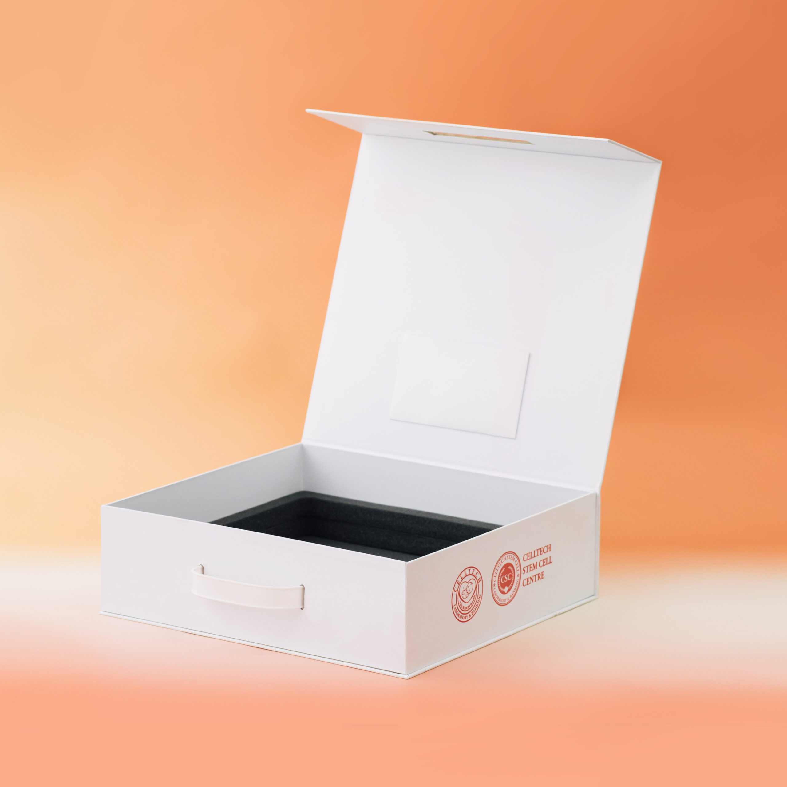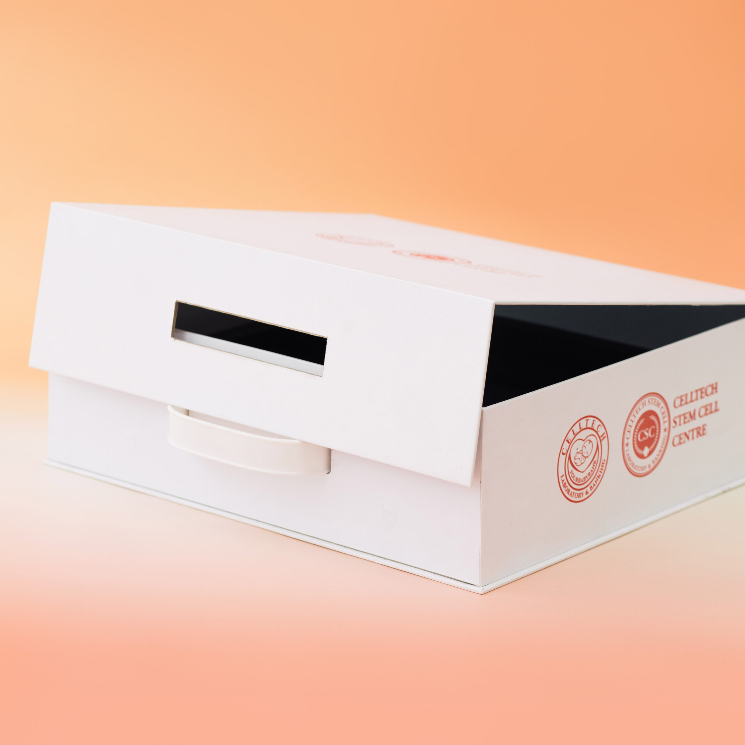 A hard box packaging for Celltech Stem Cell kit, with added handle to carry.