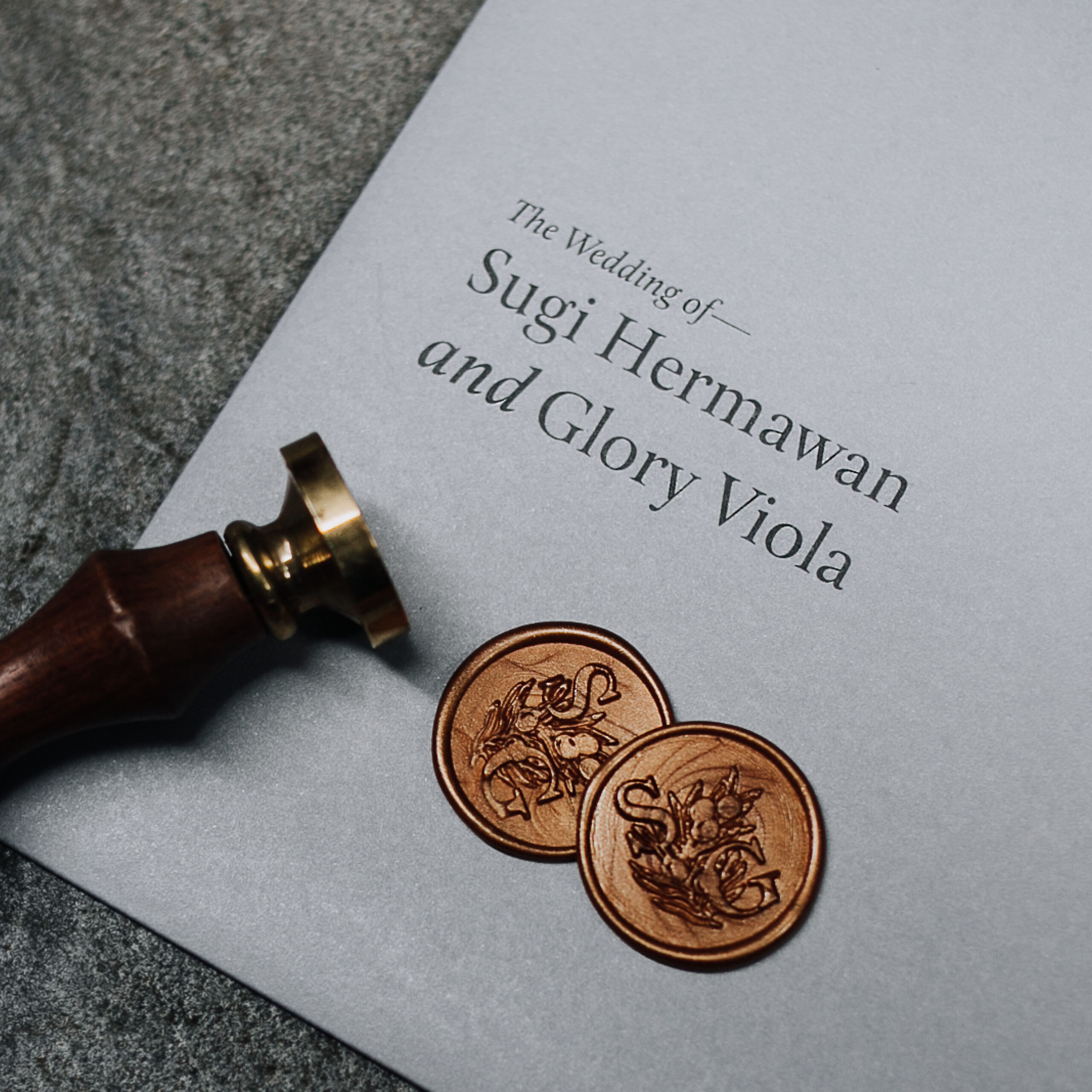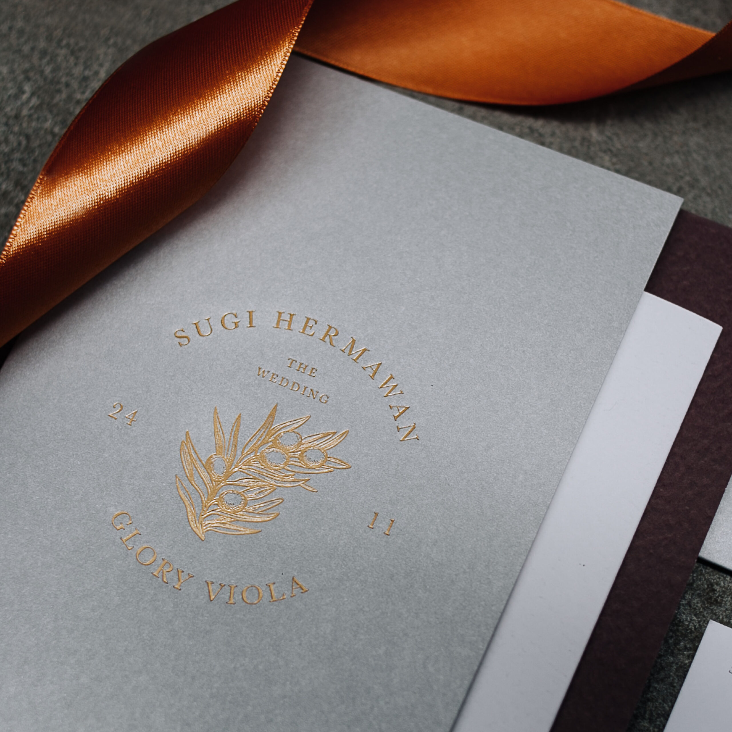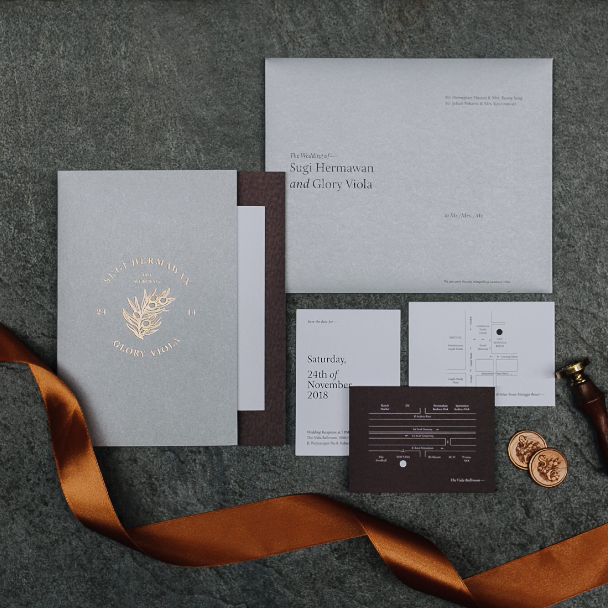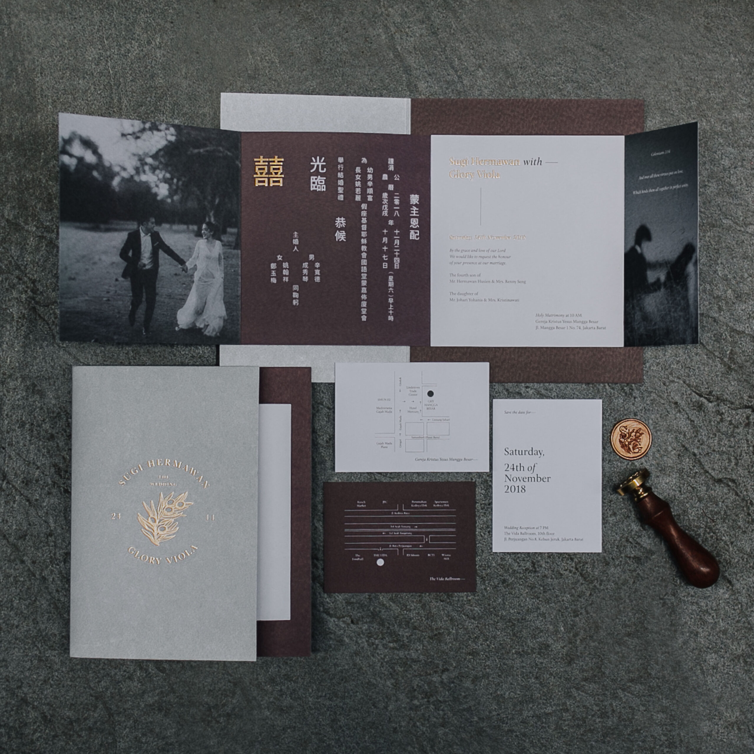 Sugi & Glory’s silver maroon-themed wedding invitation. Very unique design and layout, complete with a wax seal to give it more classic look.