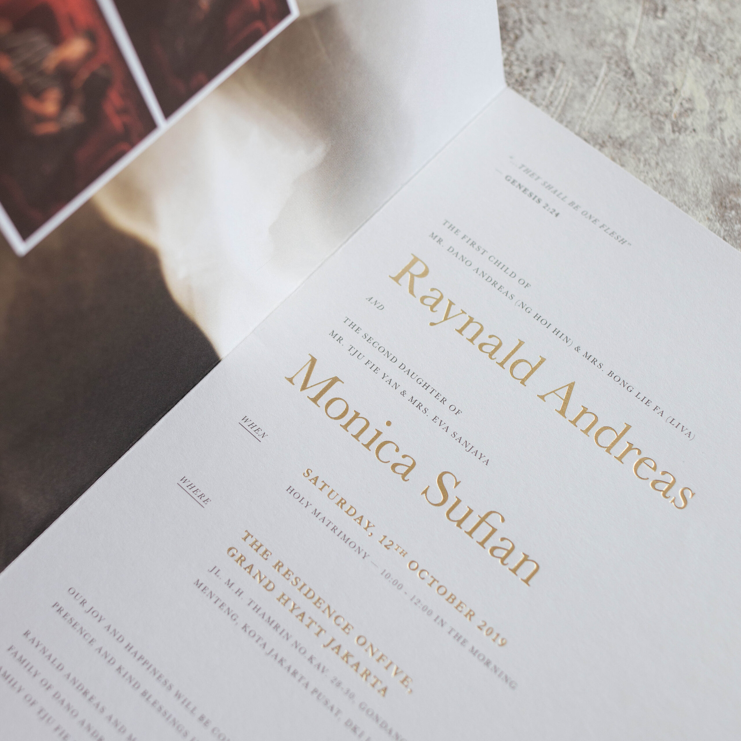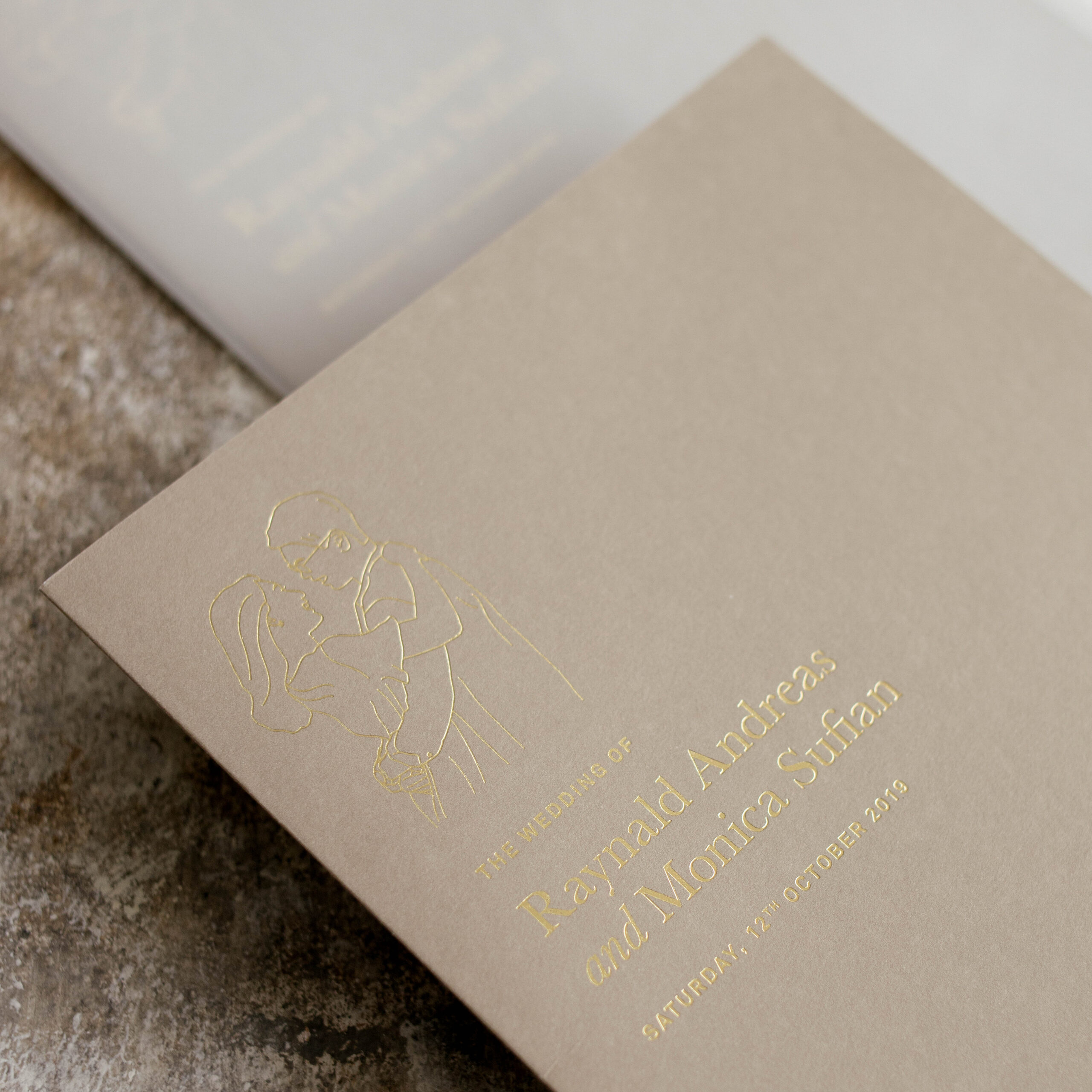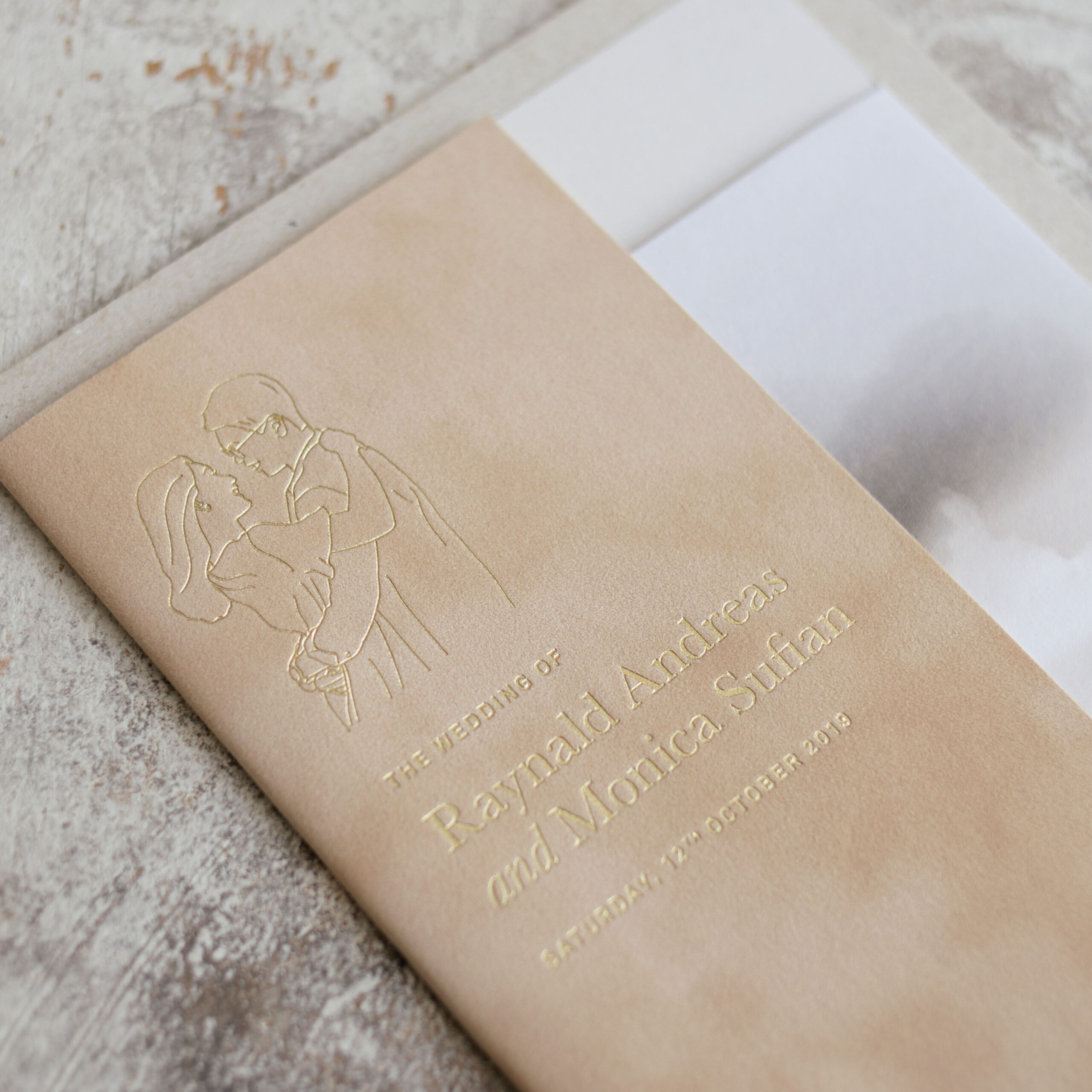 Raynald & Monica’s wedding invitation, modeled with a suede sleeve.