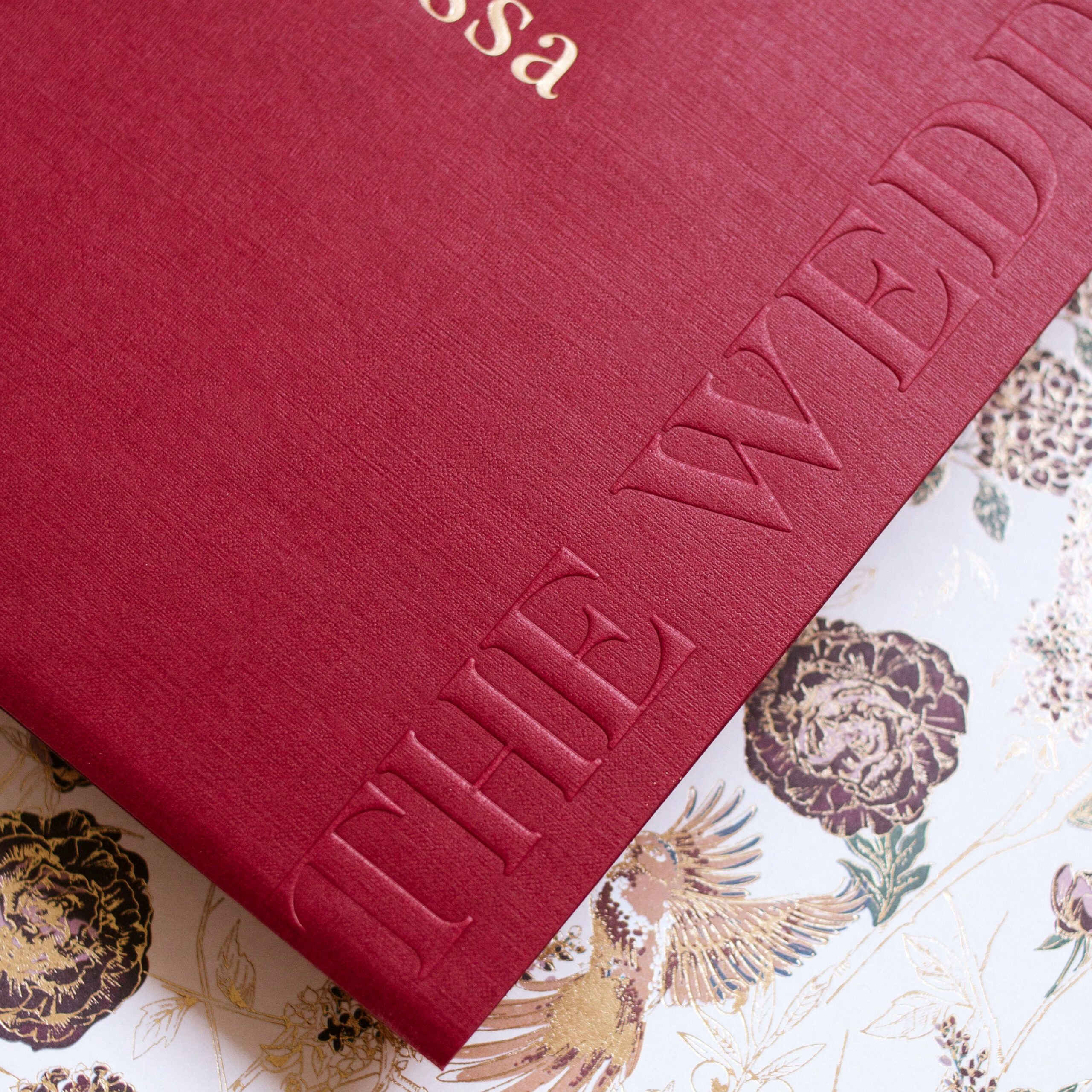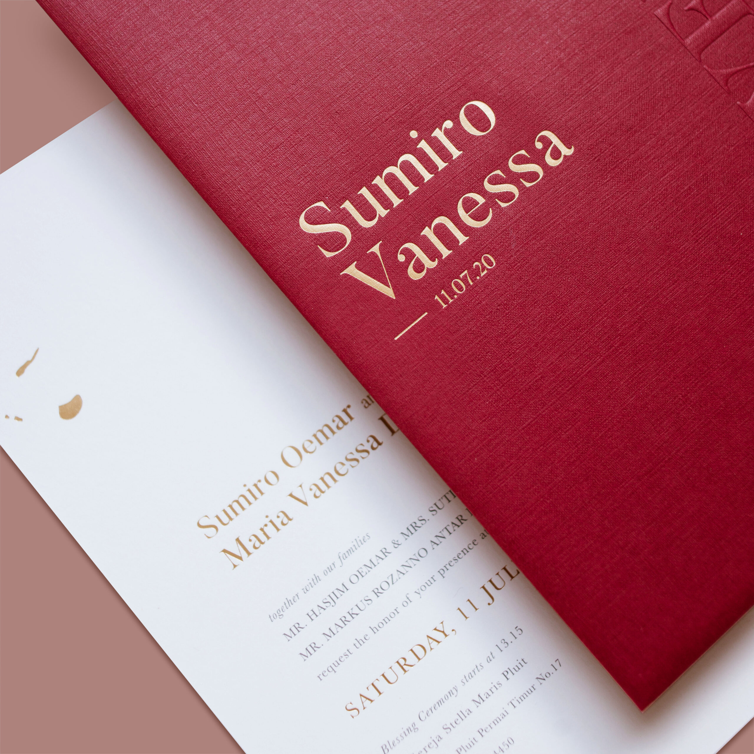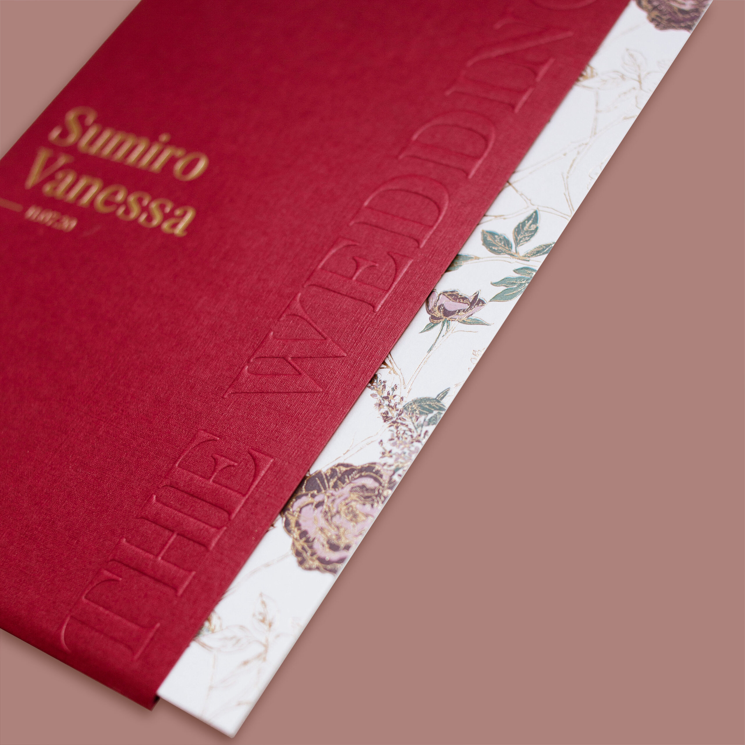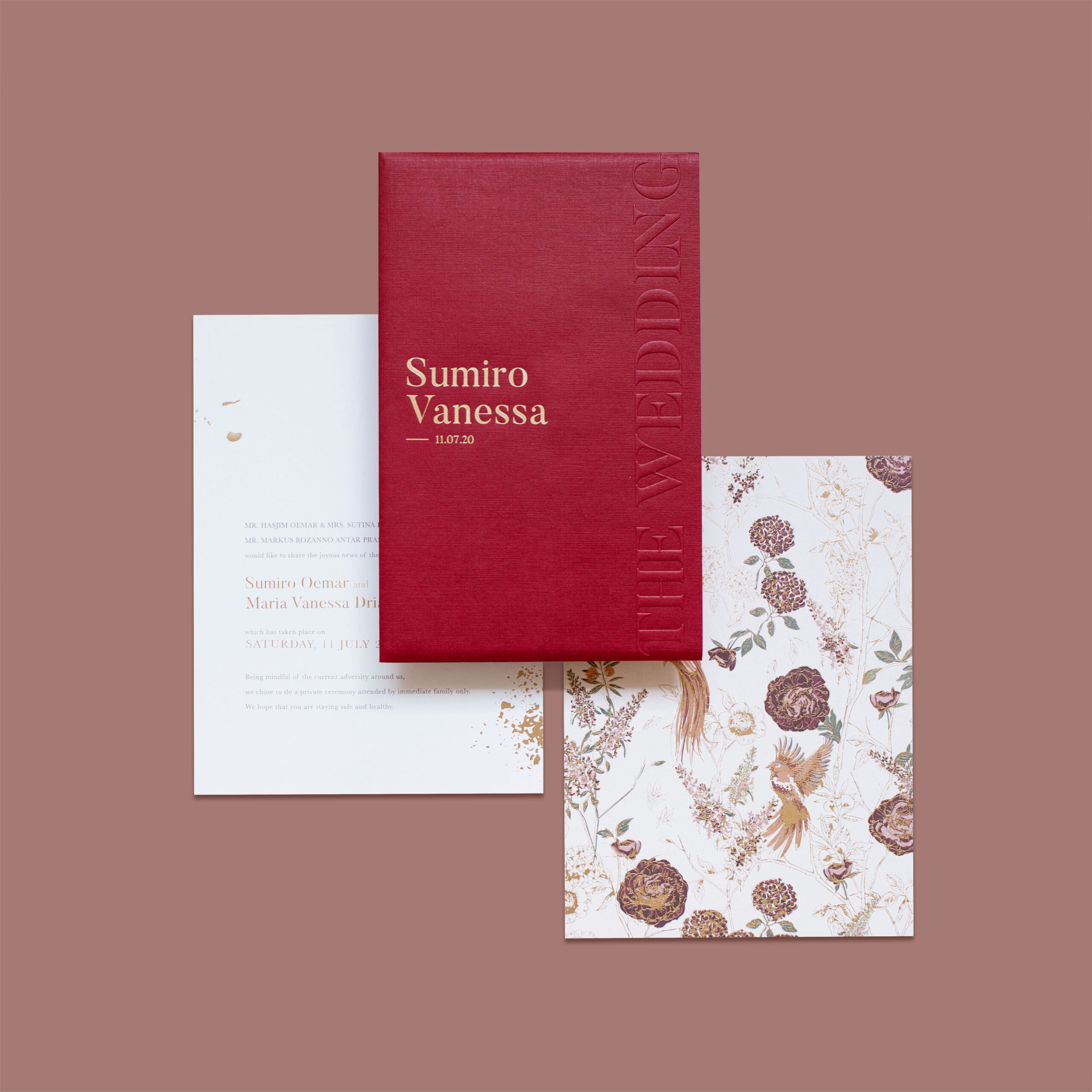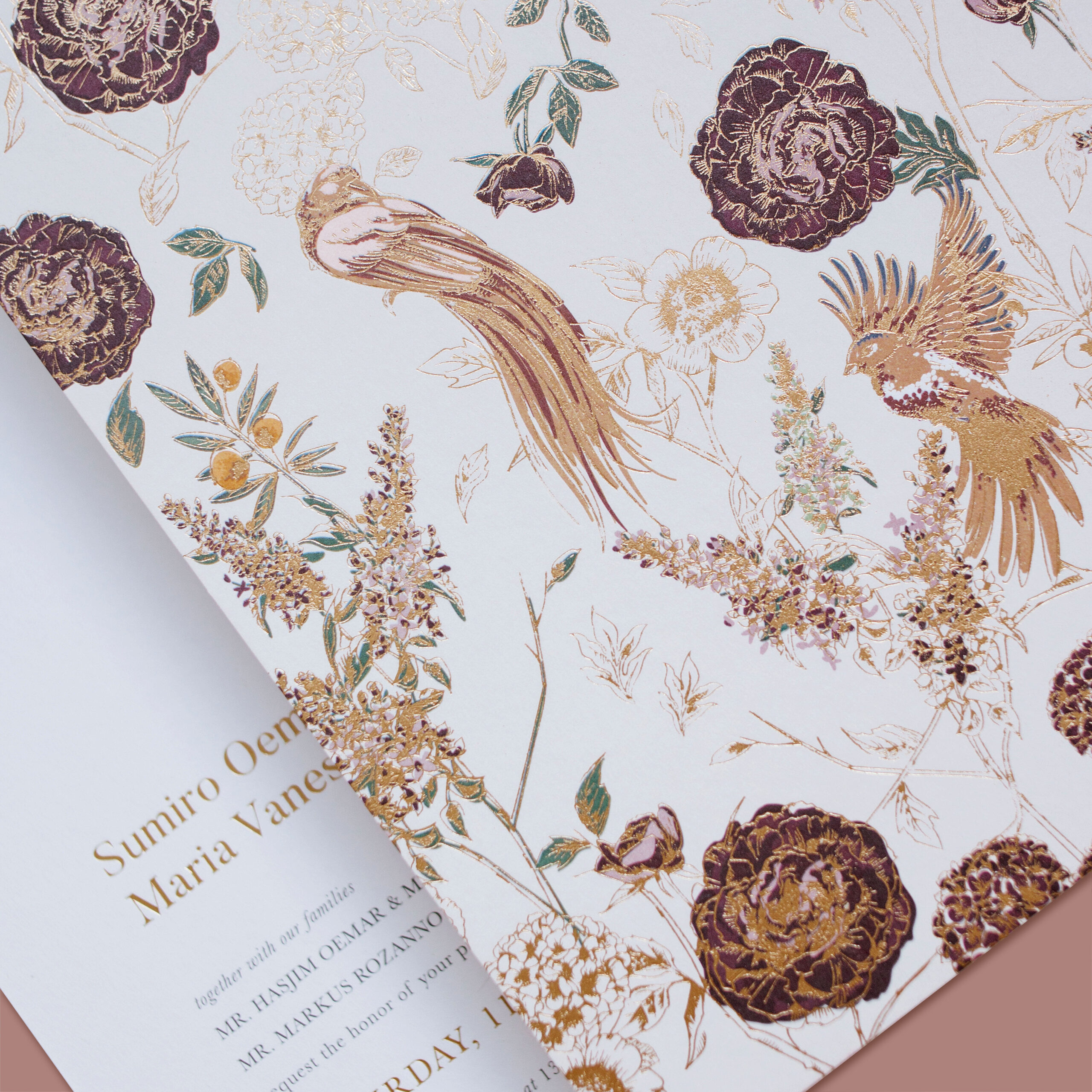 Sumiro & Vanessa’s bright red invitation, with bird foiling details.