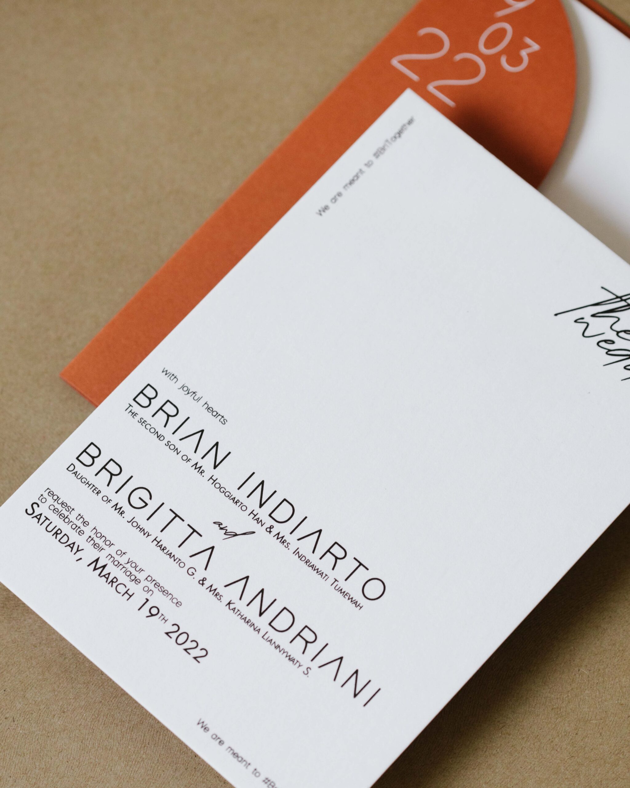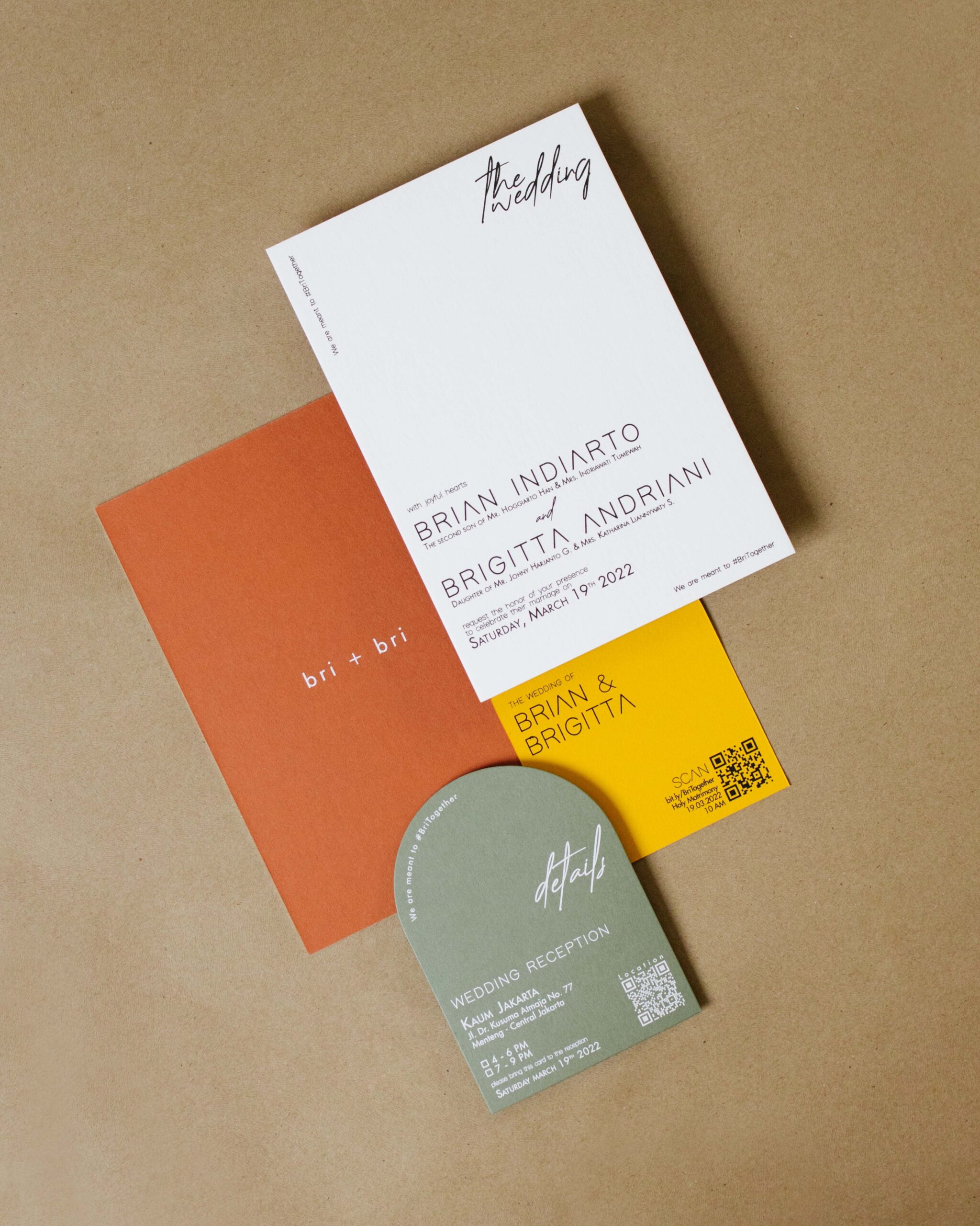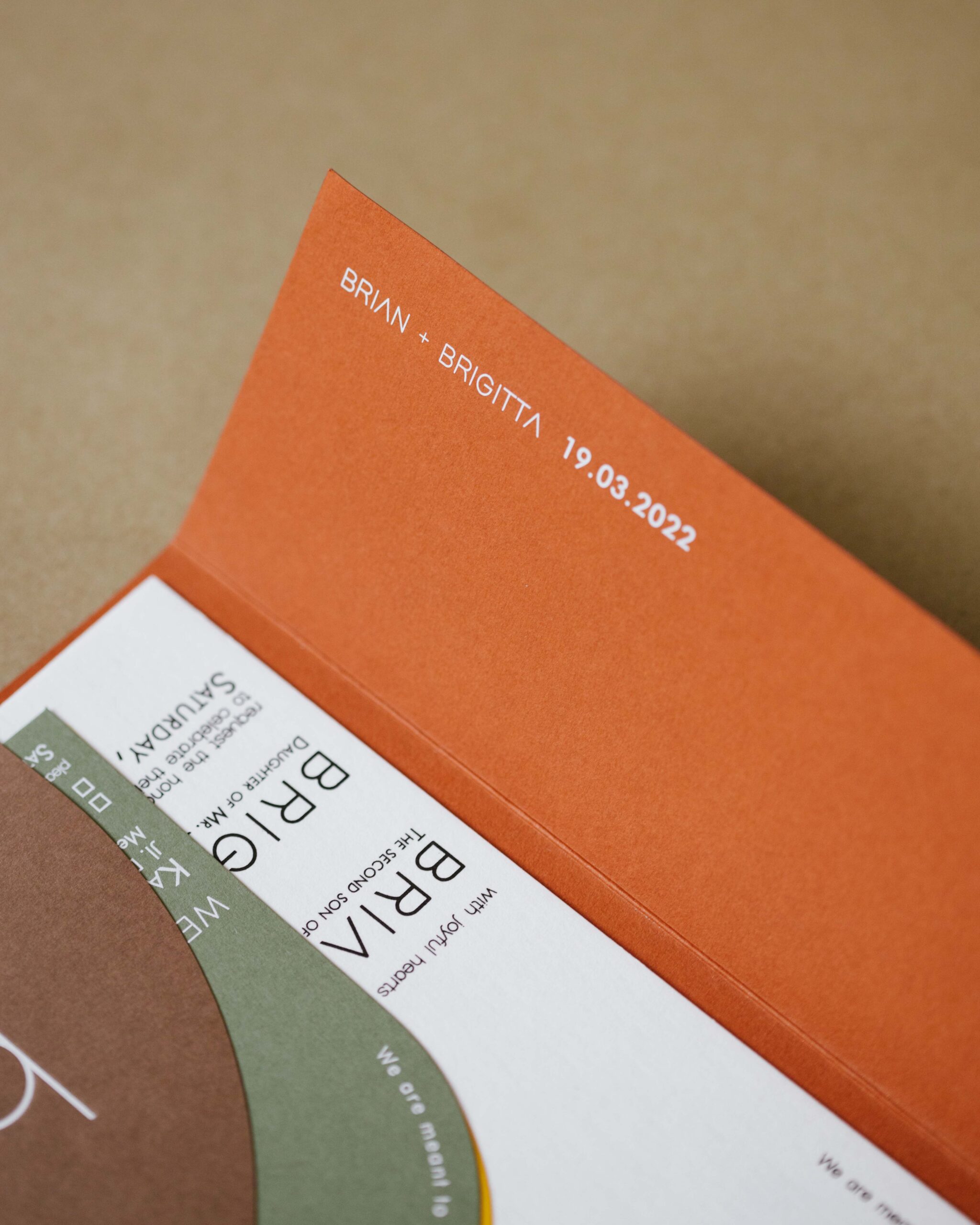 Brian & Brigitta’s colorful wedding invitation, made with only colored import paper.