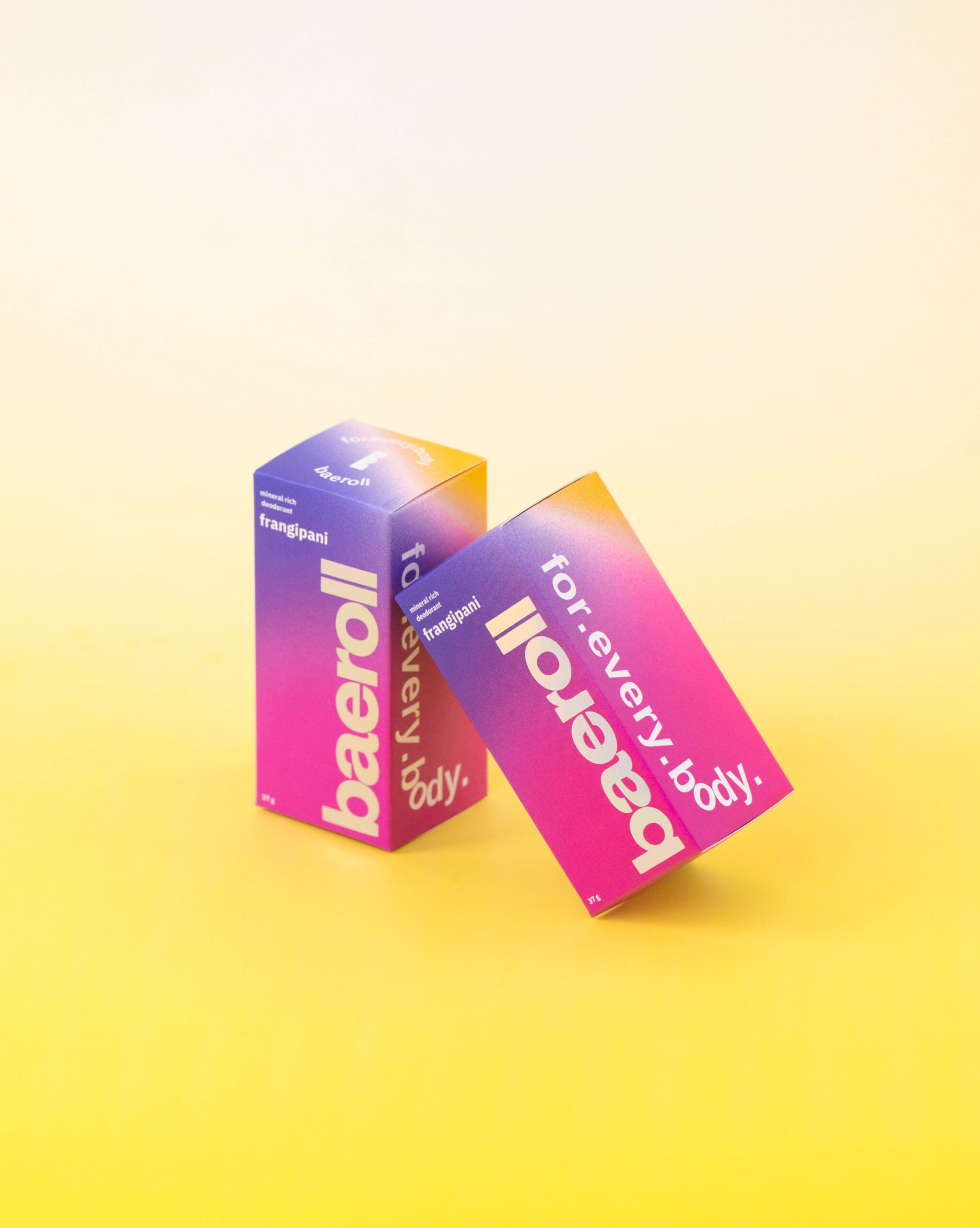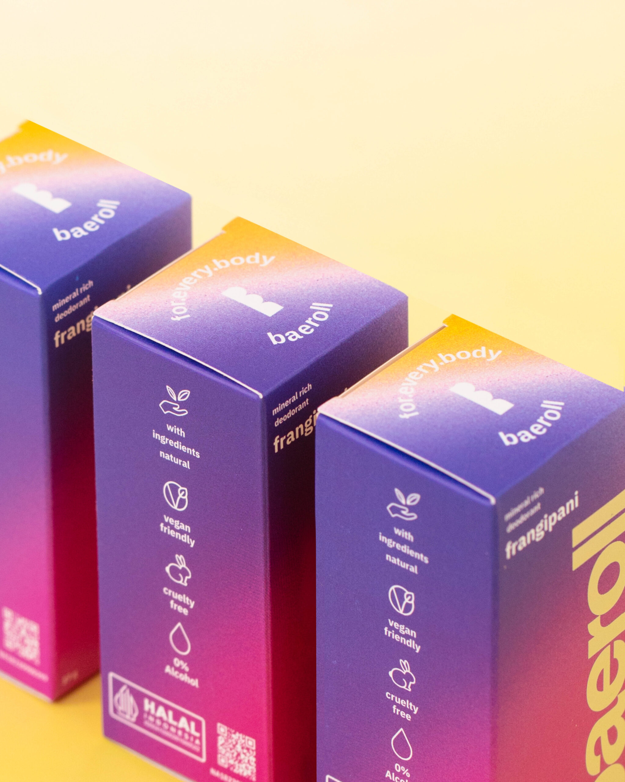 Halal certified Baeroll deodorant packaging, with holographic foiled logo.