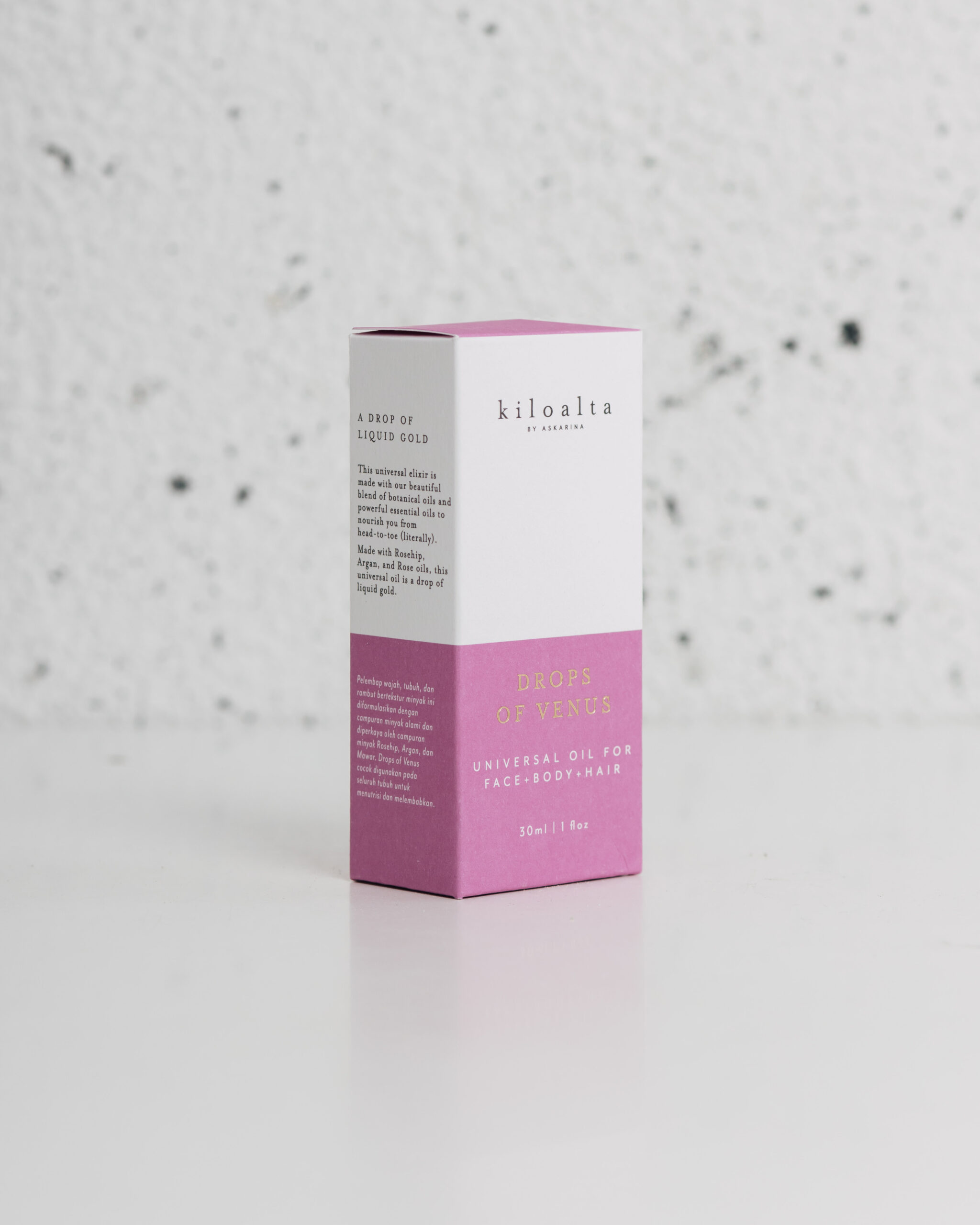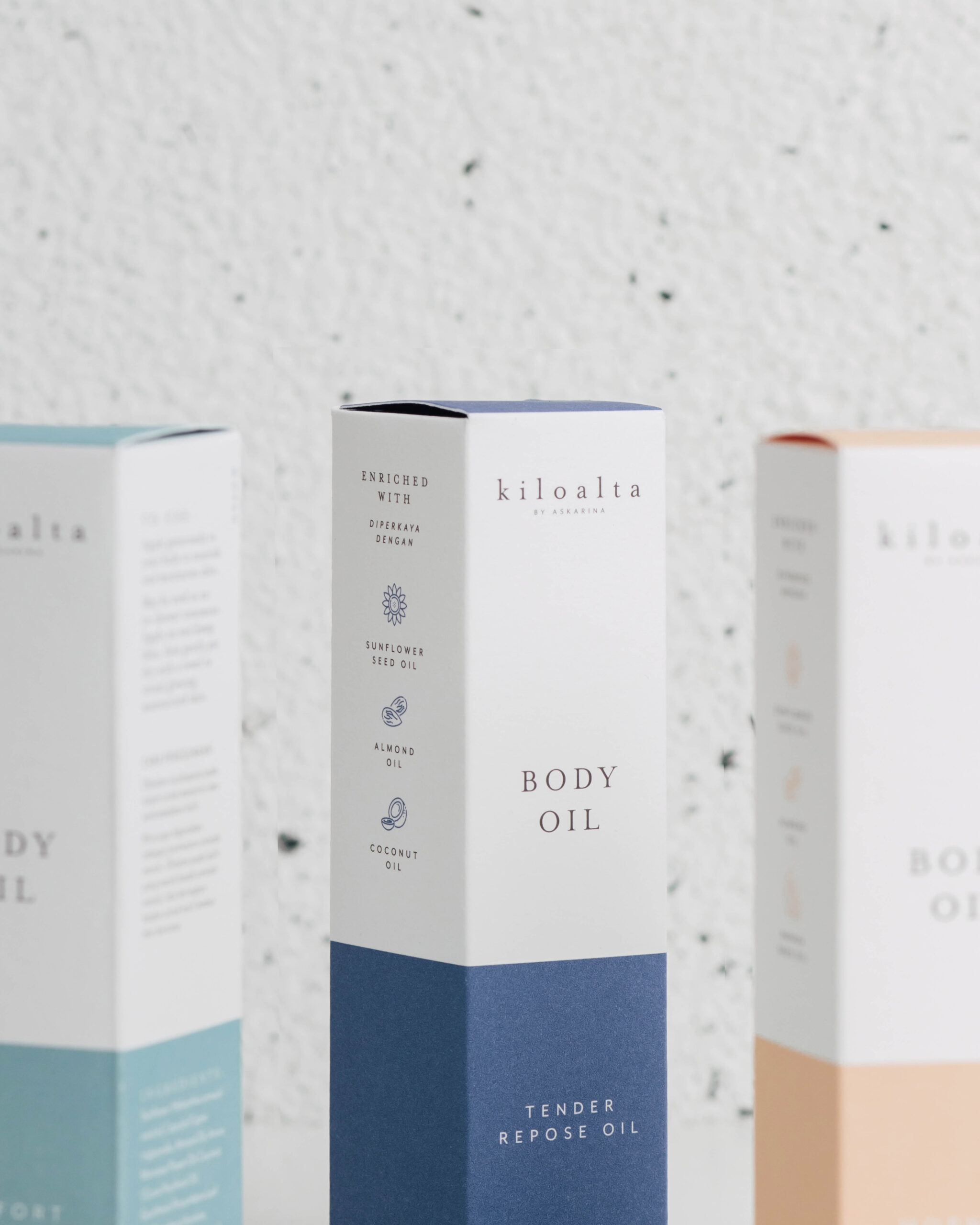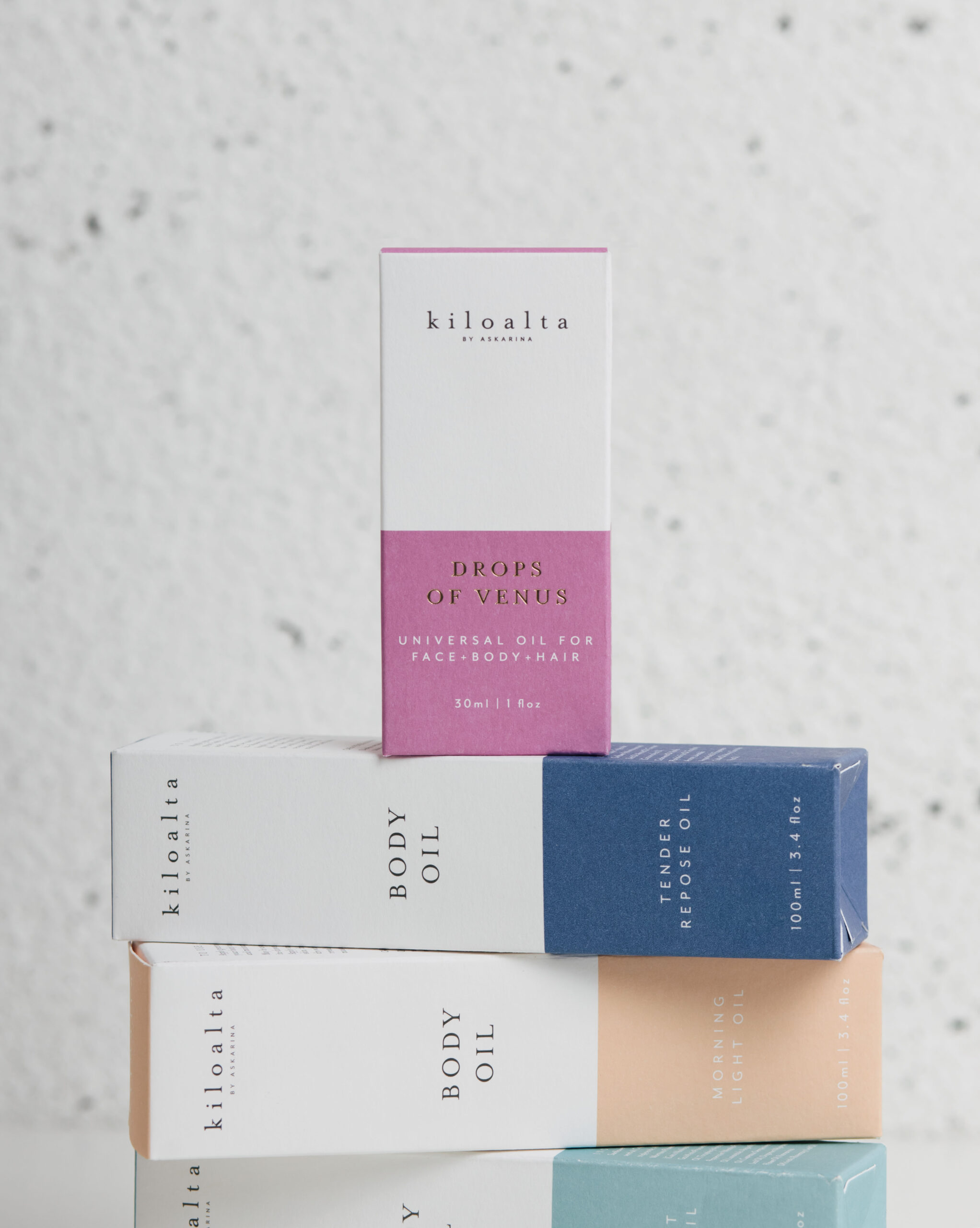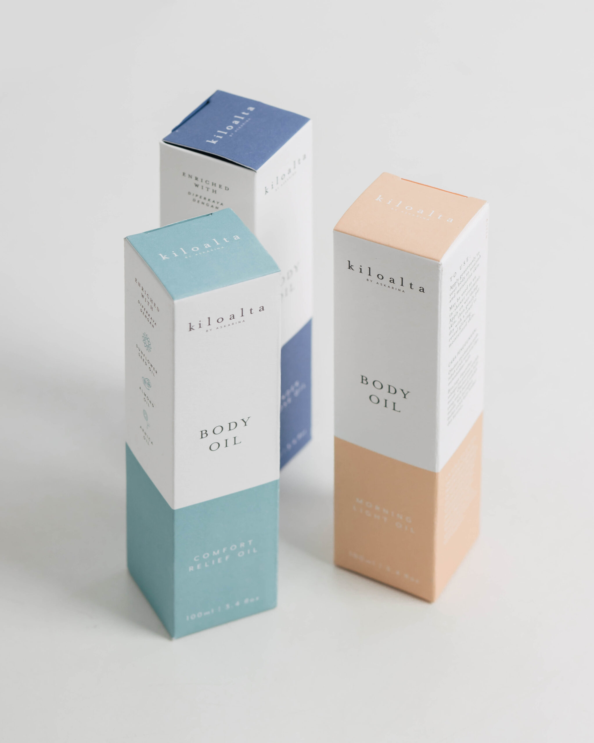 Kiloalta’s body oil skincare packaging, using a monotone for each variant.
